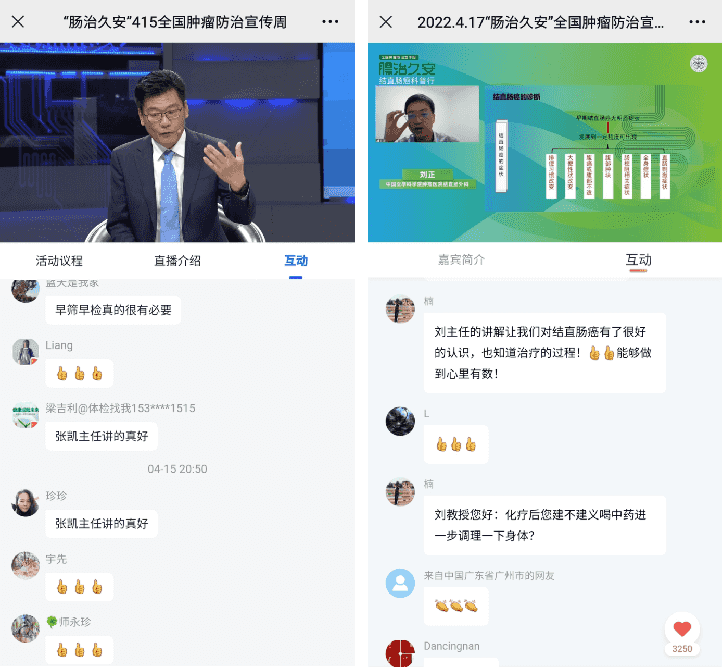 本次全國腫瘤防治宣傳周吸引了結(jié)直腸領(lǐng)域超38名各級專家大咖積極參與。其中,由中國醫(yī)師協(xié)會主辦,康立明生物協(xié)辦的“腸治久安”415全國腫瘤防治宣傳周活動共舉辦線上直播7場,邀請中國醫(yī)學(xué)科學(xué)院腫瘤醫(yī)院王錫山教授、張凱教授,首都醫(yī)科大學(xué)附屬北京友誼醫(yī)院冀明教授等共9位專家大咖參與現(xiàn)場訪談與科普;聯(lián)合5位結(jié)直腸領(lǐng)域?qū)<覅⑴c“腸治久安”宣傳周專家視頻錄制?!耙癖pB(yǎng)愛車一樣愛惜自己的身體”、“發(fā)現(xiàn)癌癥不光榮,發(fā)現(xiàn)早期癌癥才光榮”等金句也隨著科普直播的擴(kuò)散為大眾所熟知。