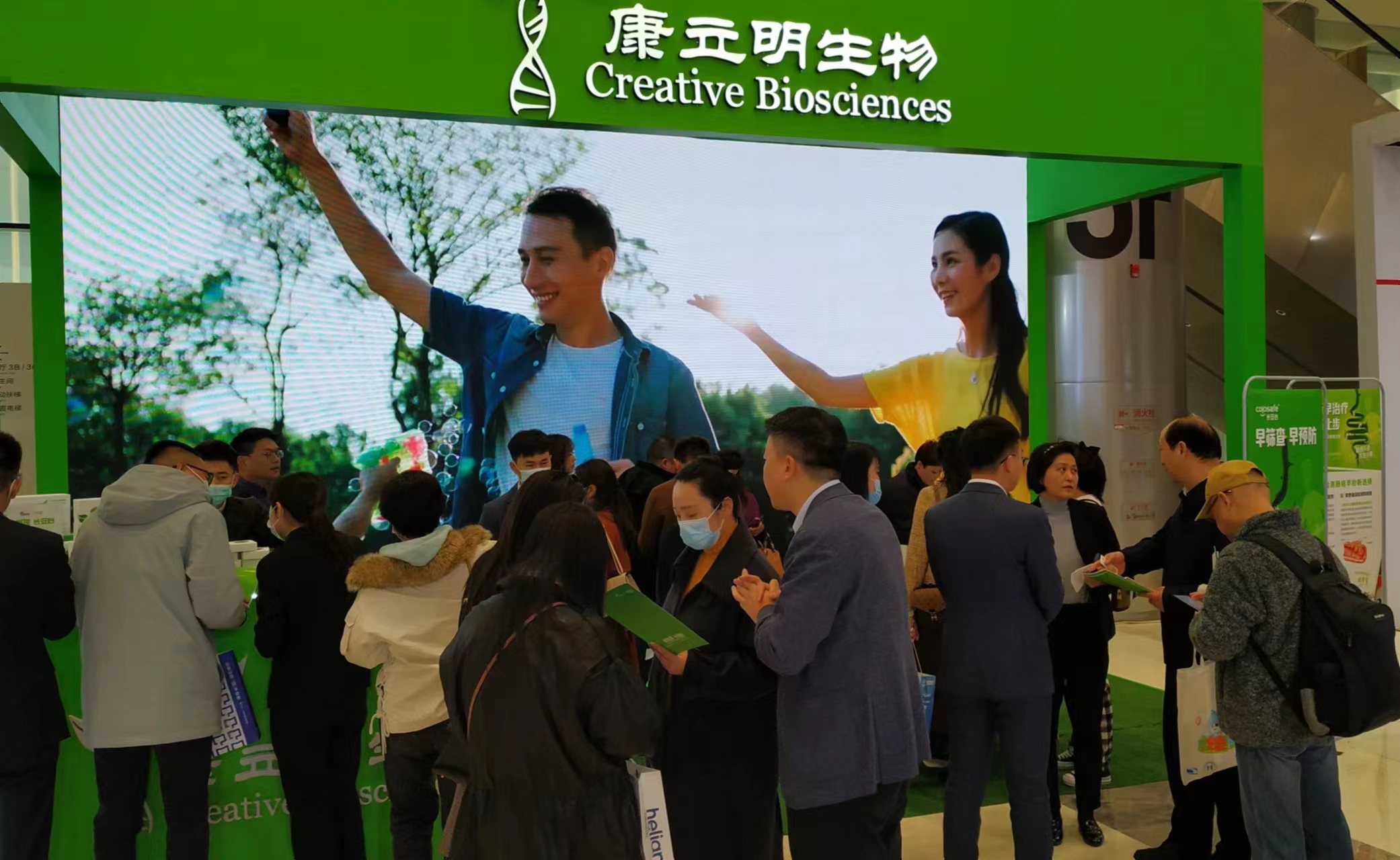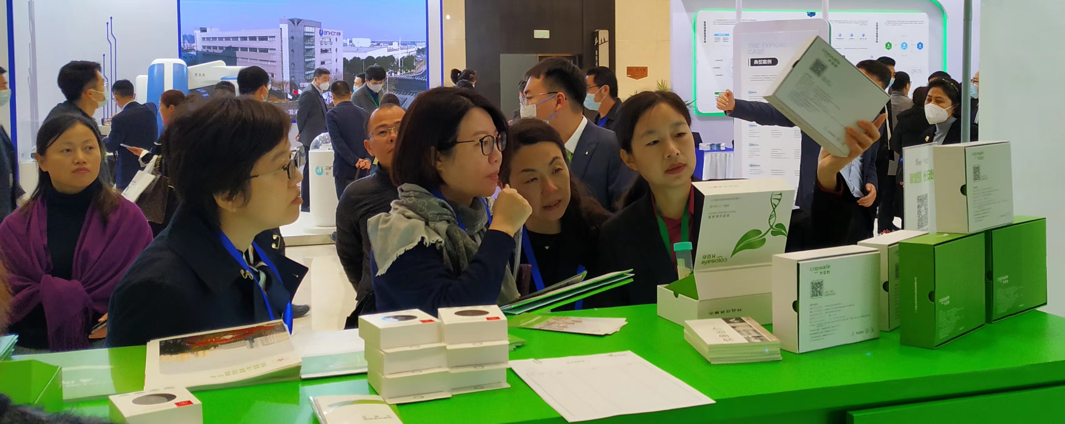 康立明生物攜長安心®糞便DNA腸癌檢測產(chǎn)品參展??盗⒚魃镎刮灰源笞匀粸樵兀源砩腿f物生長的綠色為抽象概念,構(gòu)建出一個Green Box,與現(xiàn)場展出的長安心®小盒子,在形態(tài)到寓意上相呼應(yīng),吸引了眾多專家、嘉賓到康立明生物展位打卡、交流,探討長安心®為健康管理系統(tǒng)提供的價值與成效。