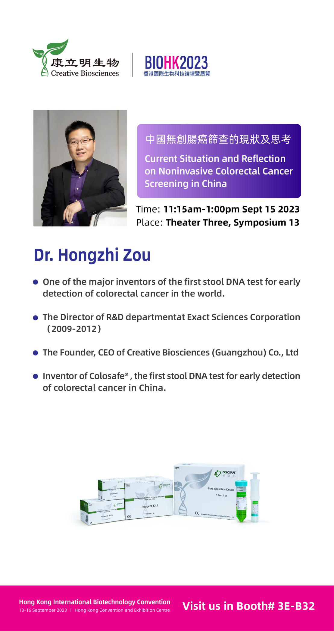 康立明生物受邀在本屆BIOHK2023的論壇上發(fā)表主題演講并在現(xiàn)場設立展位(Booth# 3E-B32),展示長安心®腸癌糞便基因檢測等多個腫瘤早期檢測產(chǎn)品以及相關自動化檢測設備,為當下腫瘤疾病預防、個性化治療、疾病監(jiān)測管理、食品安全等不同需求提供可靠解決方案。歡迎各界朋友蒞臨現(xiàn)場交流,攜手創(chuàng)造新機遇。