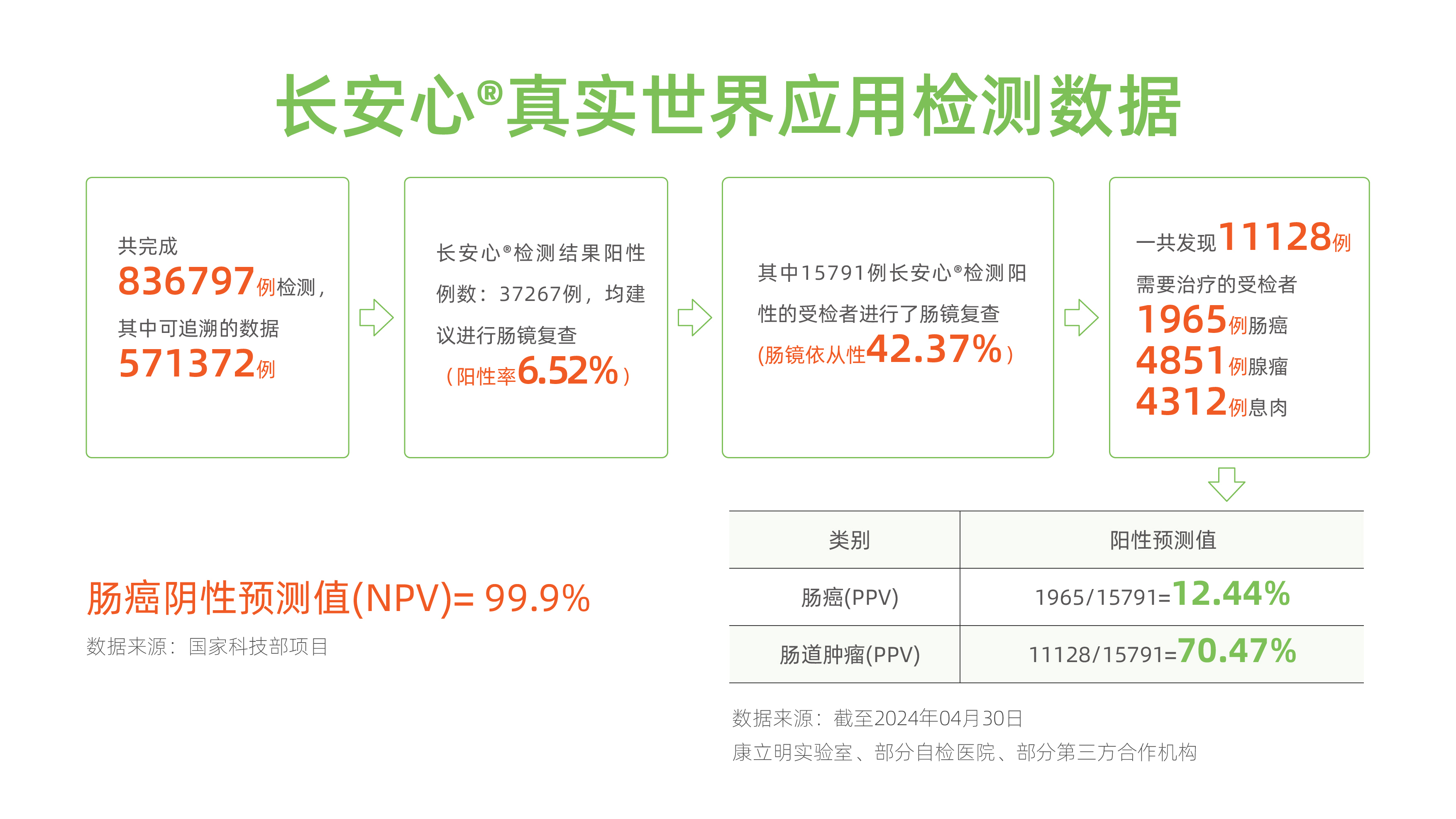 截至2024年4月30日,長安心®共完成836797例檢測,其中可追溯數(shù)據(jù)571372例。檢測結(jié)果陽性37267例(陽性率6.52%),均建議進(jìn)行腸鏡復(fù)查。其中,15791例檢測陽性受檢者進(jìn)行了腸鏡復(fù)查(腸鏡依從性42.37%),共發(fā)現(xiàn)11128例需要治療的受檢者,其中腸癌1965例、腺瘤4851例、息肉4312例。長安心®腸癌陽性預(yù)測值(PPV)12.44%,腸道腫瘤陽性預(yù)測值(PPV)70.47%,檢測性能優(yōu)異。