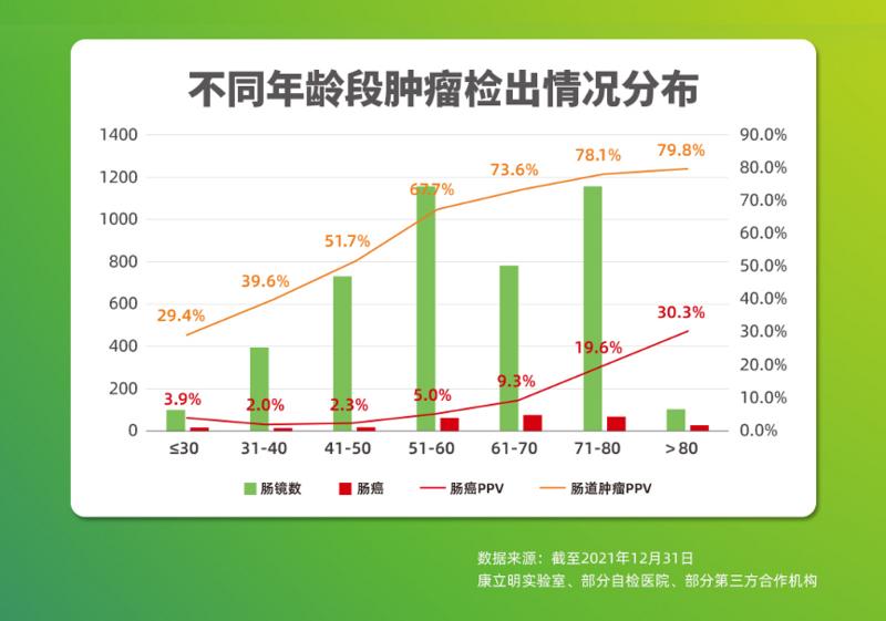 截至2021年12月,長安心®共完成33萬例前瞻性篩查,其中175528例篩查數(shù)據(jù)可追溯,12114例受檢者長安心®檢測結(jié)果陽性(陽性率6.9%),其中4970例長安心®檢測結(jié)果陽性的受檢者進行了腸鏡復查(腸鏡依從性41.0%),一共發(fā)現(xiàn)3408例需要治療的受檢者,其中755例腸癌,1444例腺瘤,1209例息肉。長安心®對腸道腫瘤的陽性預(yù)測值(PPV)為68.6%(其中腸癌的陽性預(yù)測值為15.2%)。