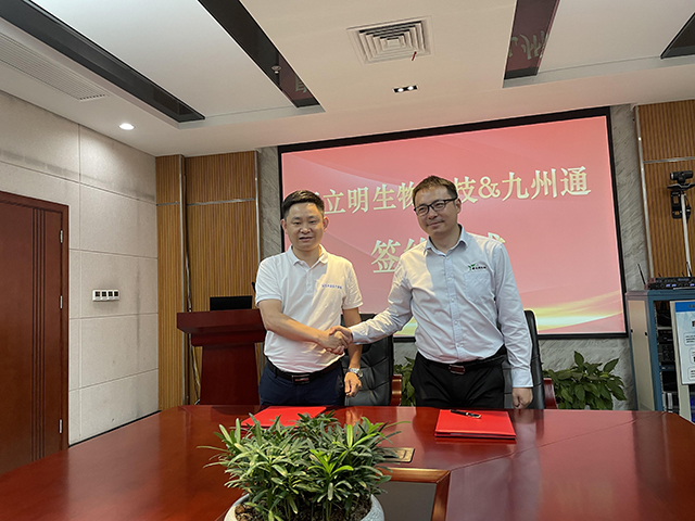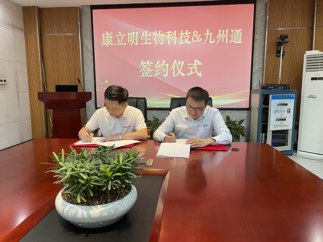 2021年9月8日下午,廣州康立明生物科技股份有限公司(以下簡稱“康立明生物”)與中國藥品零售市場第一大配送商九州通醫療器械集團有限公司在武漢市九州通總部舉行戰略合作簽約儀式。康立明生物大健康副總裁官鑫、九州通醫療器械集團副總經理楊亮代表合作雙方現場簽署了戰略合作協議,康立明生物體檢健管事業部總監開陽及九州通IVD發展本部推廣總監陳磊等現場見證了本次簽約儀式。